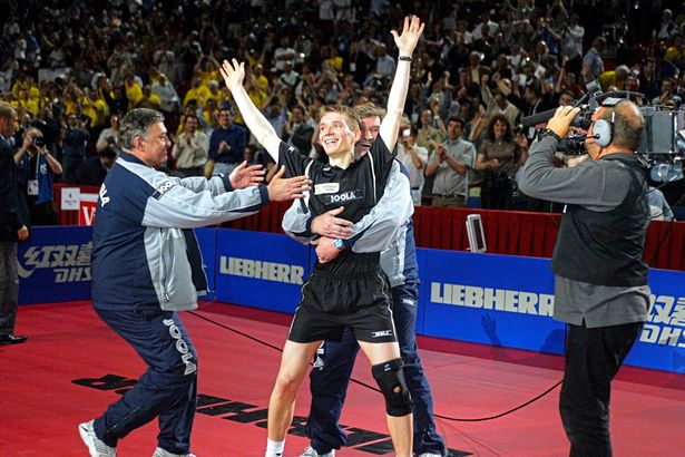 Werner Schlager, im Tischtennis-Disneyland China (trotz des neuen brasilianischen Herausforderers Robles) also eine lebenslange Ikone, weil er die damals für unbesiegbar gehaltenen Superstars aus dem Reich der Muitte entzaubert und mit seinem cleverem, unorthodem Spiel zur Verzweiflung getrieben hat –  wie damals im Viertelfinale von Paris am Weg zum Sensationstitel gegen den Weltmeister und Weltranglistenzweiten Wang, den er bei 2:3-Sätzen und 6:10 im 6. Satz mit dem Rücken zur Wan, Risoko total, tatktischen Finten und überlegten Varianten eliminierte.