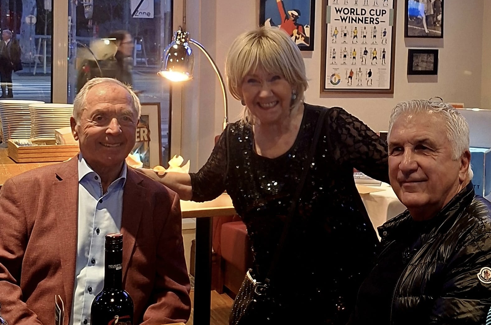 Eben dieser Hoffnungsträger Kary rief mich vor gu 50 Jahren vom Klubtelefon in  Italien aus an, um mir euphorisch mitzuteilen, dass er soeben den weltbesten Spieler, das rumänische Enfant terrible Ilie Nasase sensationell geschlagen habe. Da mir das vorkam wie im Märchen, hab ich ihmspontan geantwortet: „Hansi, bist ang´soffen ?“ Er war mir nie böse, hat mich weder geschnitten noch geklagt, was heutzutage durchaus möglich wäre, vielmehr sind wir über Jahrzehnte hinweg die besten Freunde geworden. So gut, dass wir im September 2o25 gemeinsam mit unseren Partnerinnen bei Frankie-Boy Stronach, 93, in Aurora bei Toronto eingeladen waren. Ich kann zu zu all dem und zu den Sport-und sonstigen Legenden  und Ikonen nur Dankeschön sagen. Und zu meiner besten aller Ehefrauen, der Magister Judit aus Balmazujvaros bei Debrecen und unserer Studententochter Mariella, die mitgeholfen haben, desen Event zu organsieren. Vergelt´s Gott..