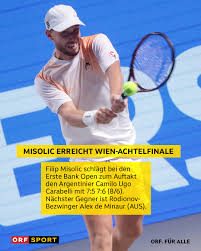 TENNIS, Erste Bank Open 500, Stadt- und Marx-Halle. Der steirische Austrokroate nützte die für ihn günstige Auslosung, um im dritten direkten Duell zum zweiten Mal den argentinischen Sandplatzspezialisten Camilo Ugo Carabelli in knapp 2 1/2 stunden mit 7:5, 7:6 zu schlagen, damit nach sechs Erstrunden-Pleiten endlich wieder zu gewinnen, das Achtelfinale zu erreichen und wichtige Punkte für sein Ranking unter den Top 100 (95) zu sammeln. Misolics schien nach einem Blitzstart zum 4:0 ungefährdet, ehe der Argentinier eine Aufholjagd startete, auf 4:4 stellte und das Match zu drehen schien, aber letztlich von einem Misolics (aus)gebremst wurde, der bei den entscheidenden Ballwechseln kühlen Kopf bewahrte. Damit ist Österreich durch den in Graz geborenen Austrokroaten weiter im Einzel dabei, im Doppel spielt ja gleich ein teils halb-österreichiches Trio mit Erler und Galloway (USA), die zuletzt in Stockholm estmals gemeinsam triumphierten, Miedler-Cabral (Por) und dem Austria-Doppel Oberleitner-Pichler.