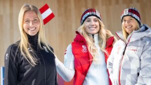 OLYMPIA-COUNTDOWN. 100 Jahre vor dem Startschuss zi den allzu aufgesplitteten Winterspielen in sieben utereinander weit entfernten Kampfstätten (Cluster Milano, Bormio, Livigno, Cortina, Val di F iemme, Toblach, Antholz) wurde am Patscherkofel vom den Präsidenten Horst Nussbaumer (ÖOC) und Maria Rauch-Kallat (Paralympics) das Olympiagewand mit Promi-Models wie Anna Gasser und Katharina Liensberger vorgestellt.
