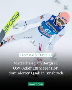 SKI NORDISCH. Skisprngen. Vierschanzentournee, 3. Station Bergisel, Innsbruck. Die rotweißroten Adler brachten zumindest in der Quakifikation auch dank drehender windiger Bedingungen den vermeintlich unschlagbaren slowenischen Überflieger Domen Prevc mit eimem ÖSV-Vierfachsieg zur Strecke und machten ihn mit dem tiefen Fall auf Platz 30 zur Schnecke. Jan Hörl holte sich Sieg und Scheck mi Minimalvorsprung vor dem gegenüber Ga-Pa wie verwandelten Stefan Kraft, Juniorenstar Embacher und Tournee-Titelverteidiger Tschofenig, dazu wurde der der 40jährige Hausherr Manuel Fettner noch Siebenter. Es scheint also alles angerichtet für einen Triumph der Widhölzl-Jünger auch wenn sich Prevc trotz schwerer (Wind) Niederlage so selbstsicher gab, als wäre nichts passier. Clemens Leitner und der Sommer-GP-Sieger Bachlinger aus der nationalen Gruppe stehen im morgigen 50er-Feld des K. o.-Durchgangs.