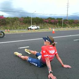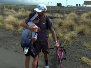 Wie hoch dieses Ergebnis von Perterer einzuschätzen istm, das konnte man im deutschen Fernsehen live verfolgen, als etwa die Topfavoritin Lucy Charles-Barclay als Führende im Marathon auf der Straße zwischen den Lavaböden plötzlich zu traumeln begann wie ein Boxer, der angeknockt oist. Sie legte Gehpausen ein, wsurde aber dann beim Torkeln statt Laufen von ihrem Ehemann und Trainer (Foto) doch aus dem Rennen genommen und zur Erstversorgung in die Auto-Ambulasnz gebrcht: Und auch jene, die vermeintlich Nutznießerin dieses Knockouts war, die Amerikanerin Taylor Knibb (Foto sitzend), wurde dann – man kennt den Ausdruck vom Radsport – nur drei Kilometer vor dem Ziel vom Mann mit dem Hammer getroffen. Aus. Ende. Audgabe. Und so gewann mit Solveig Lövseth diesen Ironwoman just eine Triathletin, die aus Norwegen kommt, also vom hohen Norden, wo es weder solch exzreme Hitze noch so hohe Luftfeuchtigkeit gibt.