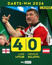 Das scheint der neue Standard zu sein,  dem auch diese angebliche Qualitöätszeitung ihren Tribut zollte angesichts der in London derzeit stattfindenden Weltmeisterschaften – mit einer ganzen Seite über dieses „sportliche“ Phänomen im Allgemeinen und den rotweißroten Beitrag im Besonderen, den 58-jährigen Mensur Suljovoic, der in sich in seiner voluminösen Mannesstäre sogar – zwischen Scherz und Ernst – dazu verstiegen hatte, den dreimal so jungen Titelverteidiger Littler, auch ein Schwergewicht, im Drittrundenduell von der Bühne zu stoßen, also zu entthronen. Post festum hat sich Suljovic als Maulheld entlarvt, weil er inzwischen schon out und heute wohl schon auf dem Weg heim ins Österreich ist. Die Niederlage fiel deftig aus mit 0:4 (0:3, 0:3, 2:3, 1:3) und gerade drei „Legs“, also so was wie Games im Tennis, was einem 0:4, 0:4, 2:4, 1:4 nach dem erweiterten Zähl-Modus der Next-Generation  entspricht.