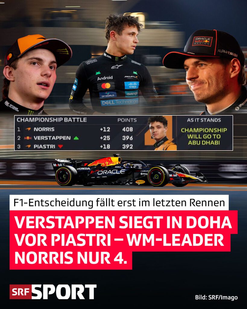 Kommen wir zum Qatar-GP, in dem alles für die im Sprint dominanten McLaren zu laufen schien mit Norris vorn und Piastri auf Platz drei, ehe es zu einer Safety-Car-Phase kam, die Verstappen zum Reifenwechsel nützte, während Norris und Piastri gemeinsam weiter aufs Gas stiegen. Ich bin zwar kein Logistiker und schon gar kein Technik-Genie, aber wenn ich in einer solchen, womöglich die WM entscheidenen Situation zwei WM-Kandidaten habe, dann muss ich frei nach Adam Riese zum Schutz der Eigeninteressen zwangslöufig mit einer Doppel-Strategie fahren und nicht nur auf den Plan A setzen, der sich als Fluch für die Briten, aber als Segen für den fliegenden Holländer erwies. Wke so ein Lapsus hochbezahlten Intelligenzbestien passieren kann, fragt sich ein einst jahrelanger egleiter (und oft auch Mitwisser) von Lauda und Co bei den GP-Rennen, oder nicht? Ich erlaube mir dazhu noch die Frage, warum von den TV-Insidern meines Wissens nach noch nie thematisiert wurde, dass die Foermel 1 ab 2026 einen Milliarden-Hauptsponsor hat, der Pepsi Cola heißt und mit dem vn khm promoteten Sting Energy Drink direkter Konkurrent der Bullen wie des McLaren-Sponsors Monster, ebenfalls Energy-Riese. Wäre ebenso spannend wie die Alternative zur ORF-Frage: Wwer war wann der letzte Österreicher in derf Formel 1? Kurzum, der ORF stellt ja damit auch im patriotischen Sinne seine GP-Übertragung in Frage oder ad absurdum. Jedenfalls wird die Formel 1 uhter dem Deckmantel der Dramatisierung zum Absurdistan. Bin gespannt, was da unter der Decke alles passiert, was nie ans Kicht kommt. DAöazuvseierwöhnt, dass ein Gerichtsurteil dem Brasilianer Massa post festum und gegen Widerstand von Ecclestone und Co erlaubt hat, den WM-Titel einzuklagen, den er durch geheime Absprachen seinerzeit verloren hat. Interessante Koinzidenz mit anderen seltsamen Zufälle in der Formel 1.